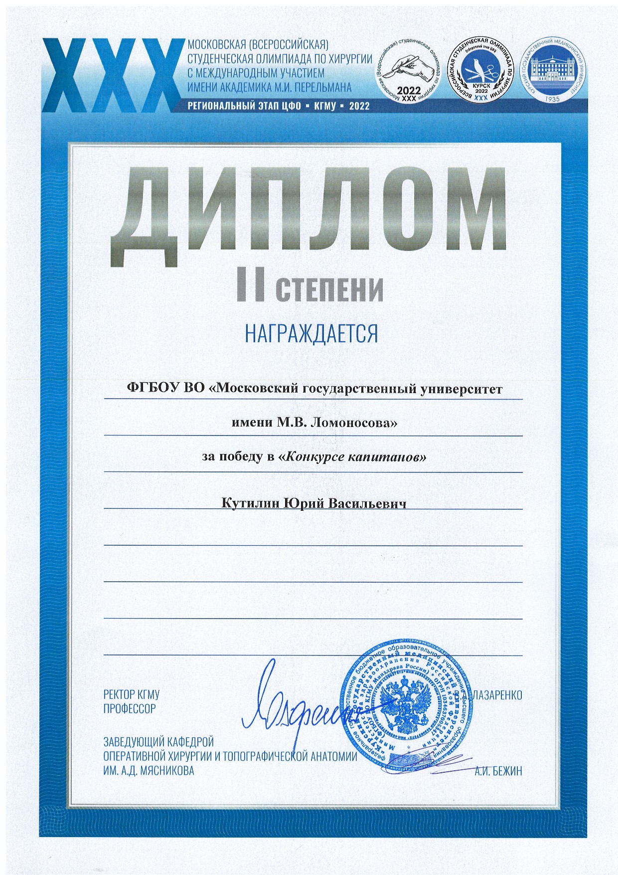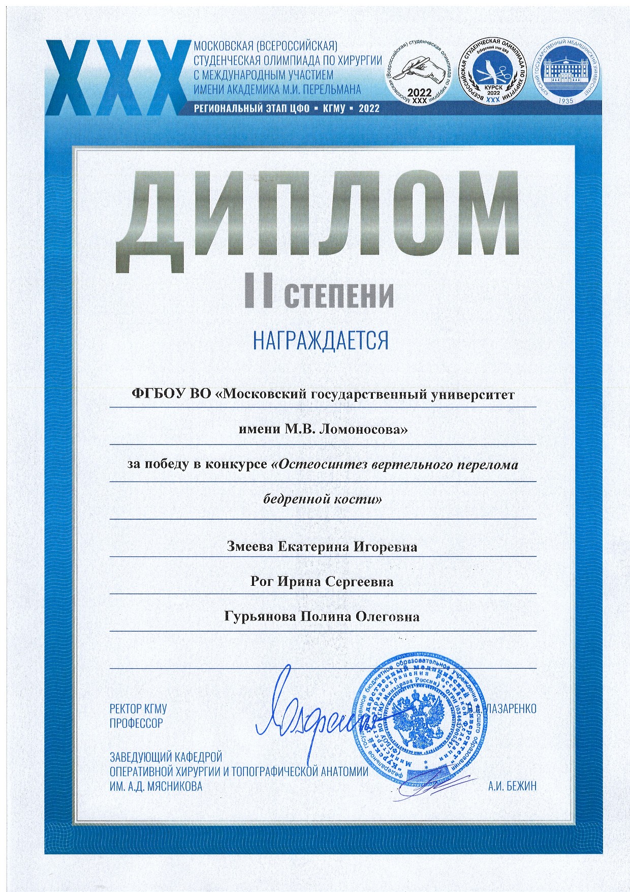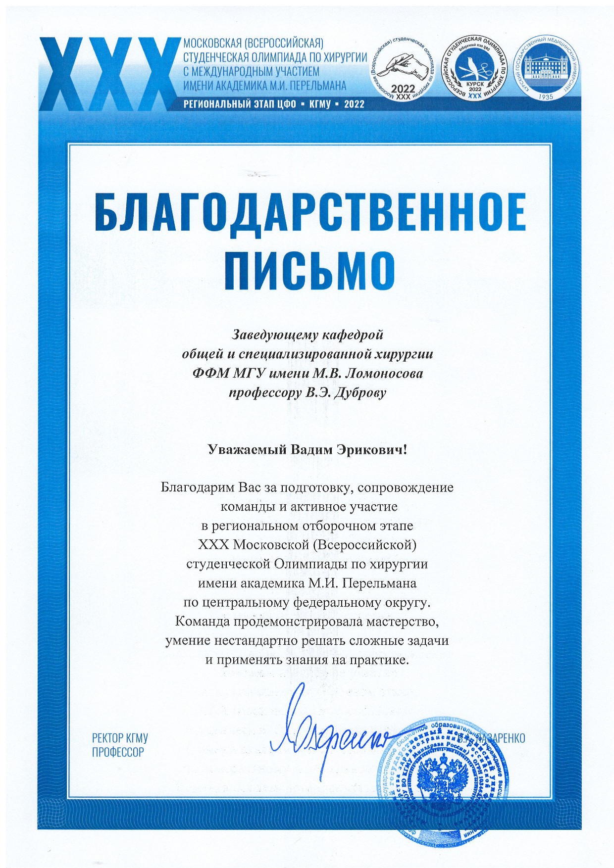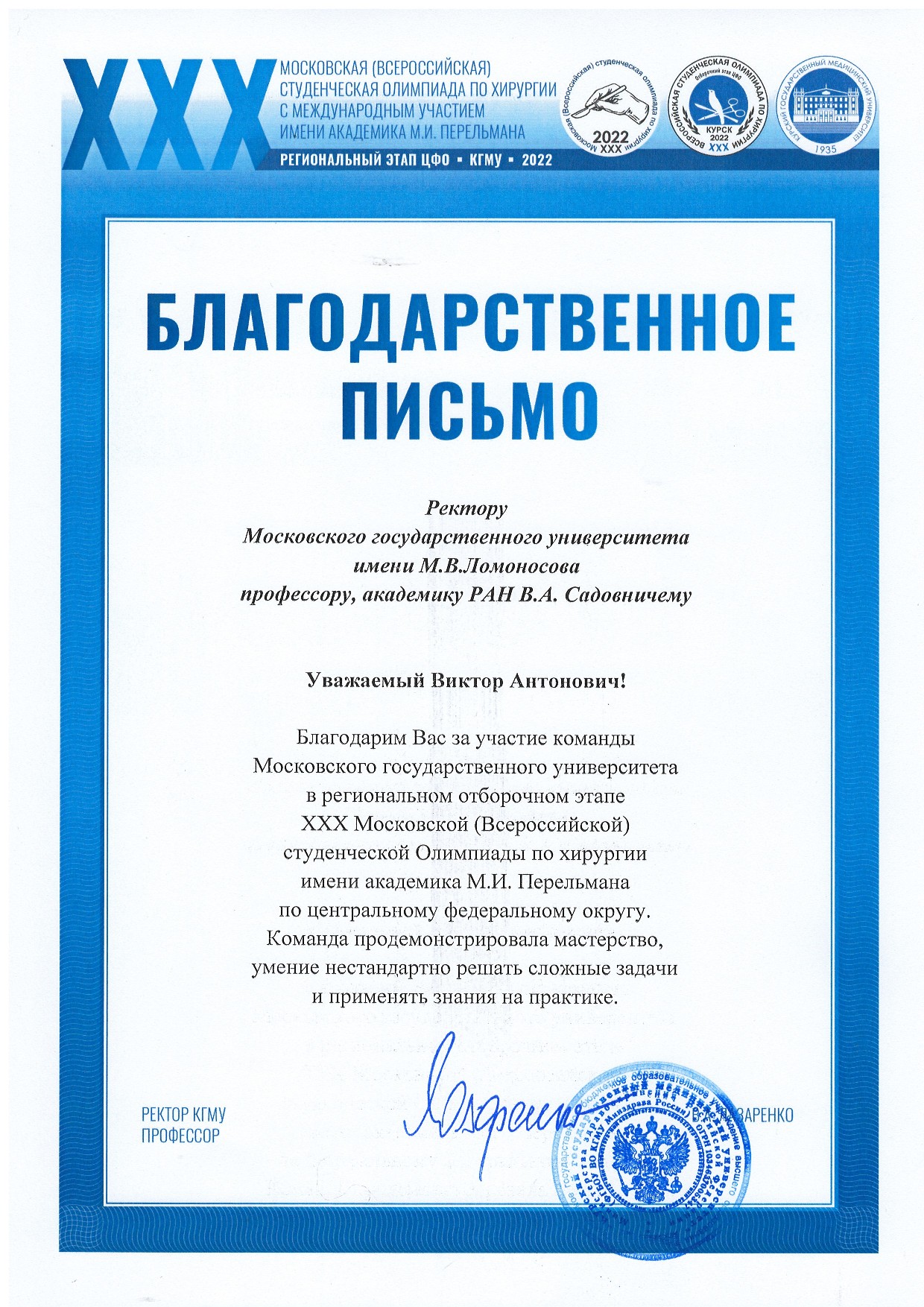 Благодарственные письма за подготовку и активное участие команды в олимпиаде получили заведующий кафедрой общей и специализированной хирургии ФФМ МГУ имени М.В.Ломоносова, профессор Вадим Эрикович Дубров и ректор МГУ имени М.В.Ломоносова, академик Виктор Антонович Садовничий.
