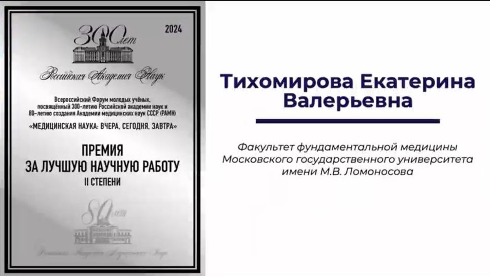 Поздравляем выпускницу факультета фундаментальной медицины МГУ Тихомирову Е.В. с успешным выступлением на Всероссийском Форуме молодых ученых