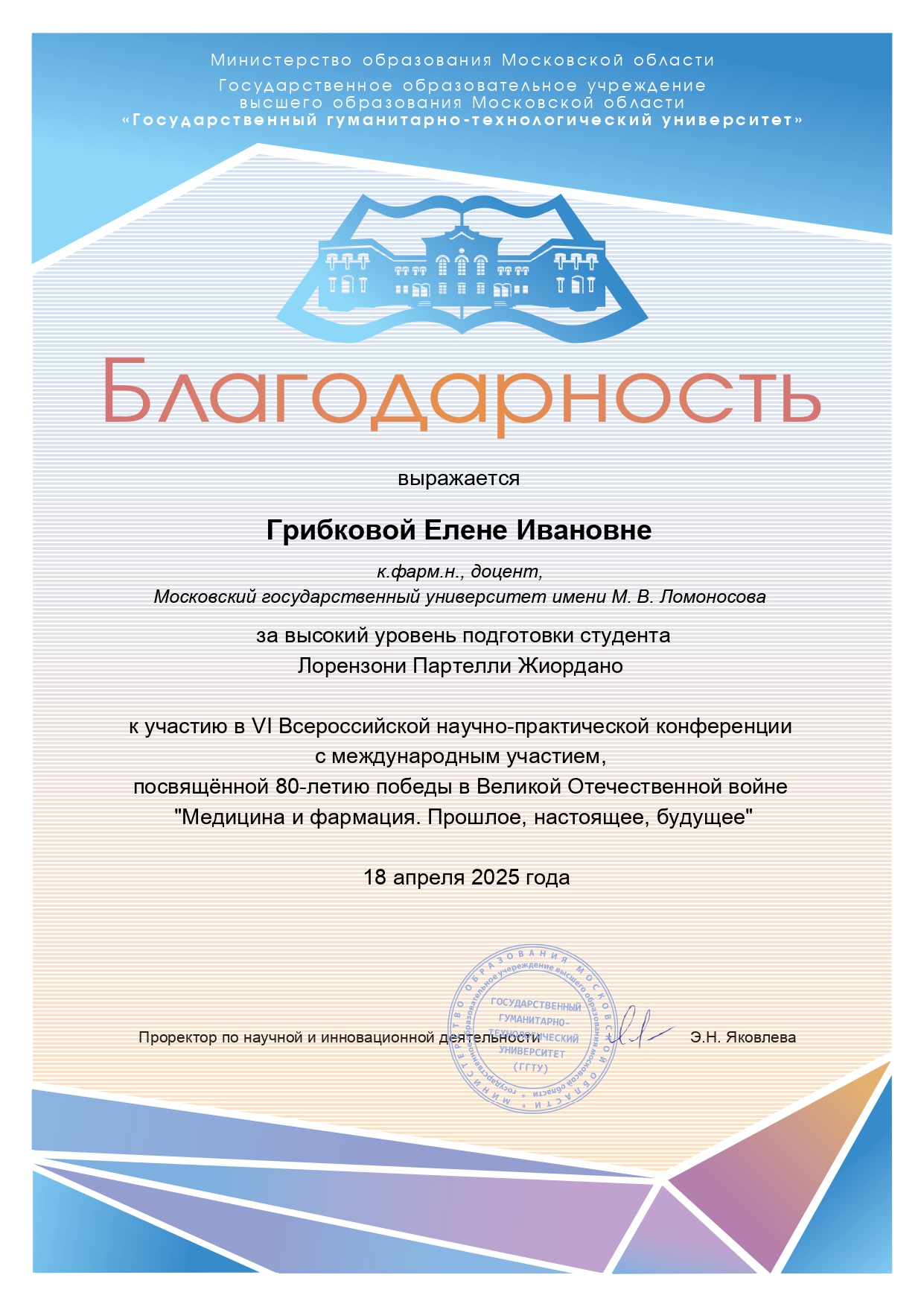 29-го апреля студент 2-го курса Лорензони Партелли Жиордано выступил (онлайн) с докладом "Лекарственные растения – первые помощники в года Великой Отечественной войны" на VI Всероссийской научно-практической конференции с международным участием "Медицина и фармация. Прошлое, настоящее, будущее", посвященной 80-летию Победы в Великой Отечественной войне и получил диплом I степени. Поздравляем!