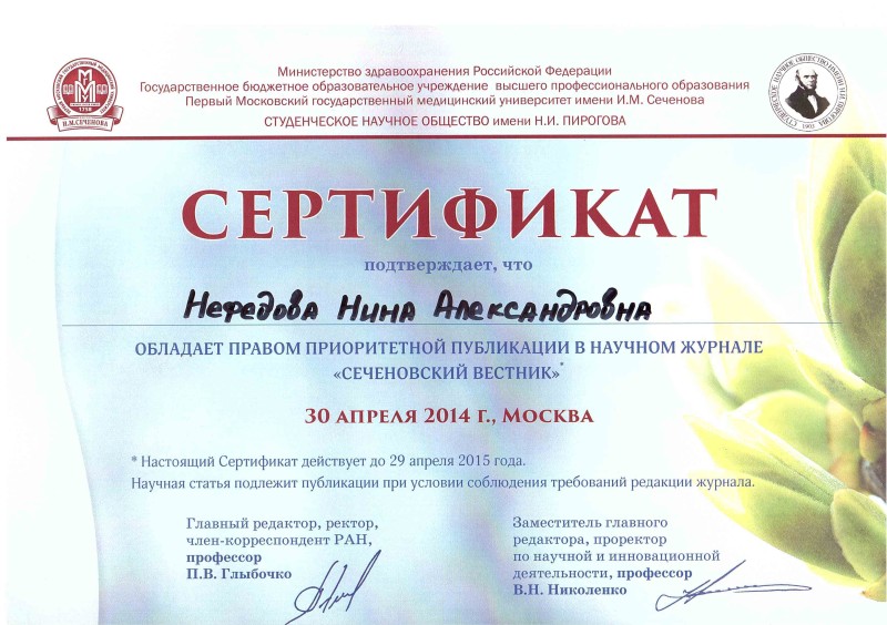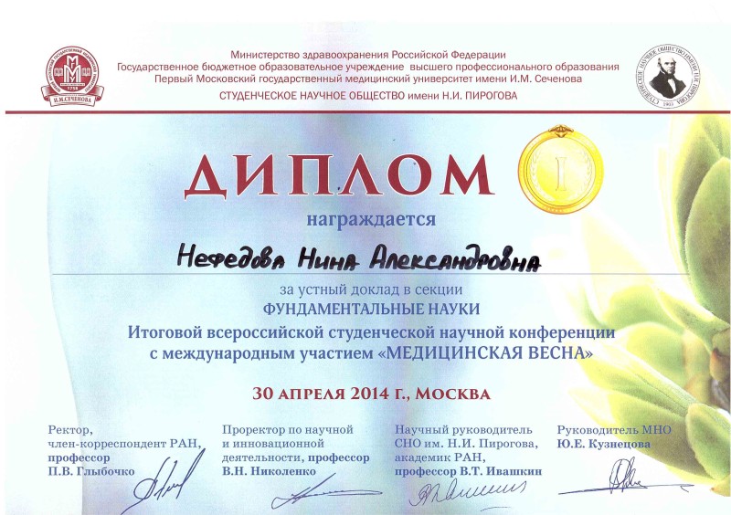 Поздравляем студентку 6 курса Нефедову Нину Александровну с победой на конференции "Медицинская весна"