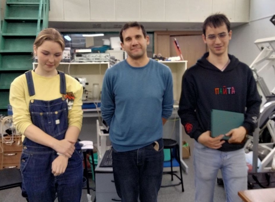 Исследователи биоэлектрической активности сердца: В.С. Кузьмин (в центре) и его ученики – М.К. Нифонтова и Д.М. Белошапка (полночь с 20 на 21 сентября 202 года)