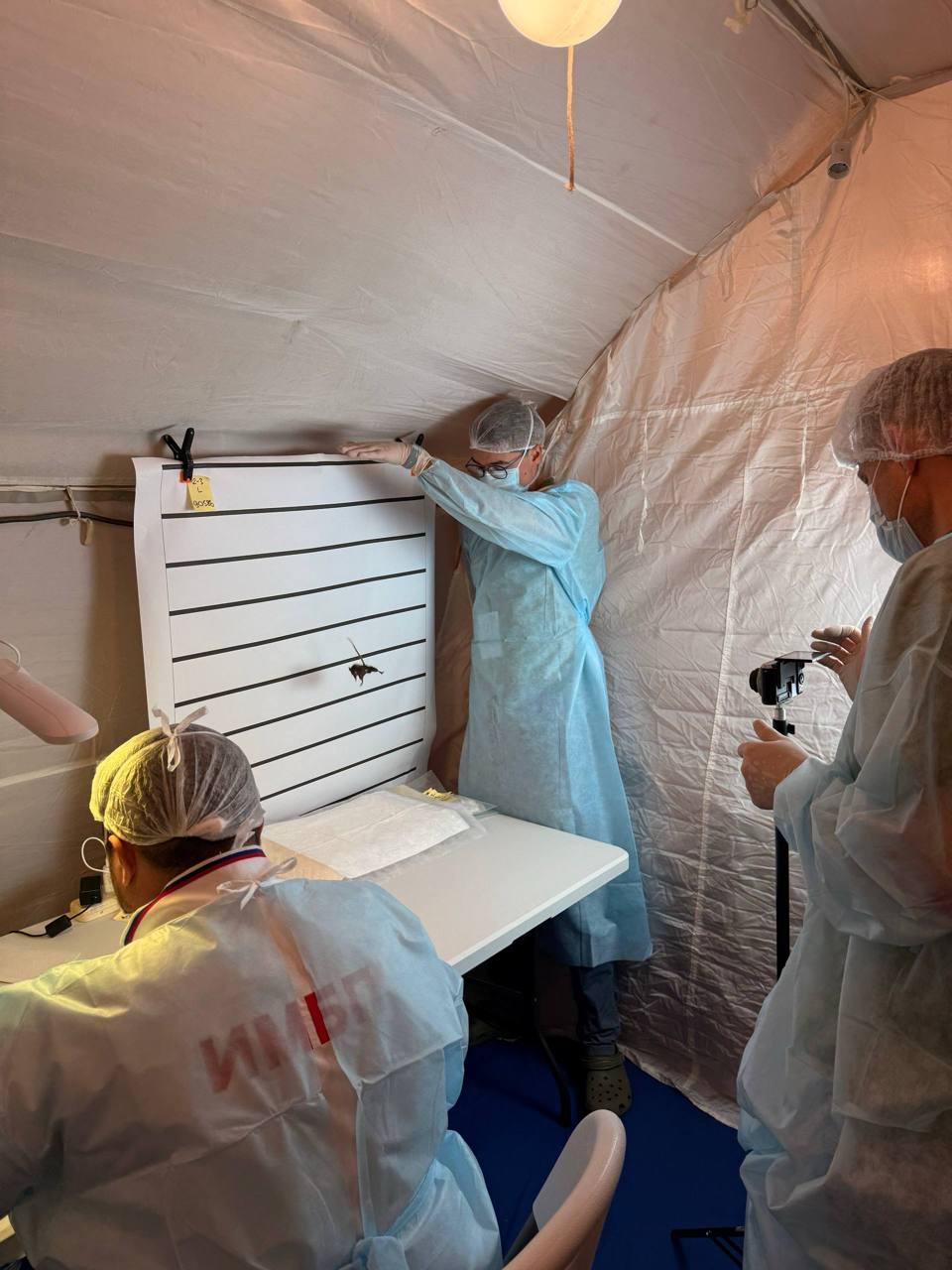 А.А. Андреев-Андриевский и его сотрудники проводят тестирование вестибулярной функции мышей в первые часы после посадки биоспутника (Оренбургская область, утро 19 сентября 2025 года, автор - Эльмира Якупова).